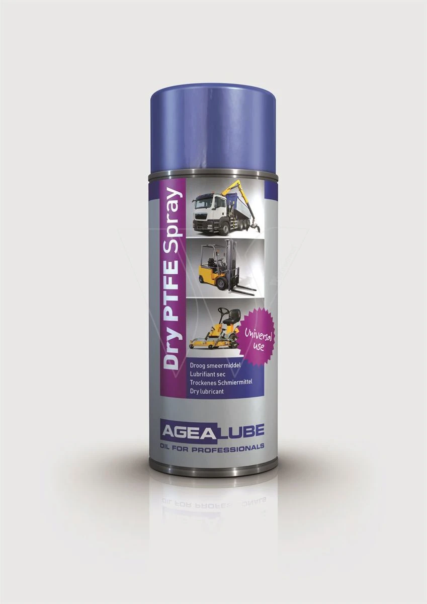 Dry PTFE Spray is een universeel droog smeermiddel voor het behandelen van mechanische onderdelen van metaal en kunststof waarbij geen olie of vet mag achterblijven. Dry PTFE Spray voorkomt slijtage en vastklemmen en heeft sterke vocht- en roestwerende eigenschappen. Voorkomt het aankleven van stof en vuil. Toepassingen: vorkenbord heftruck, telescoopmasten van laadkranen, wielen van maaidek, spindelsmering, deursloten, ritsen, ruitenwissers, trekhaken, geleiderails stoelen, scharnieren van ovens, geleiderails ramen. Gebruiksaanwijzing: Voor gebruik de spuitbus schudden. Dry PTFE Spray in een dunne laag aanbrengen. Na het verdampen van het oplosmiddel (circa 1 minuut) wordt een beschermende, droge PTFE-film gevormd.