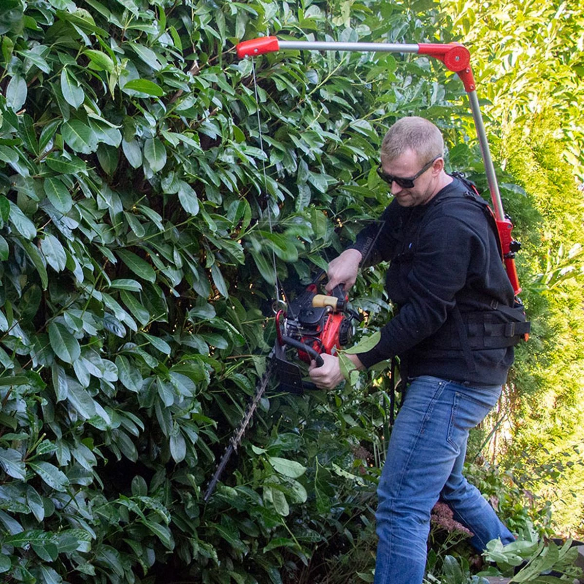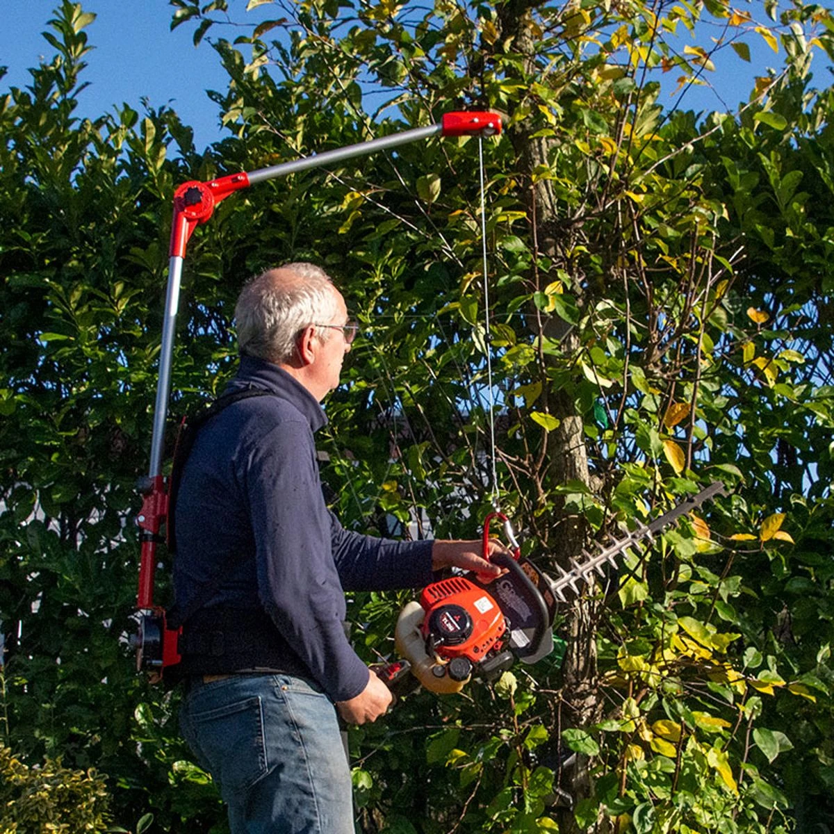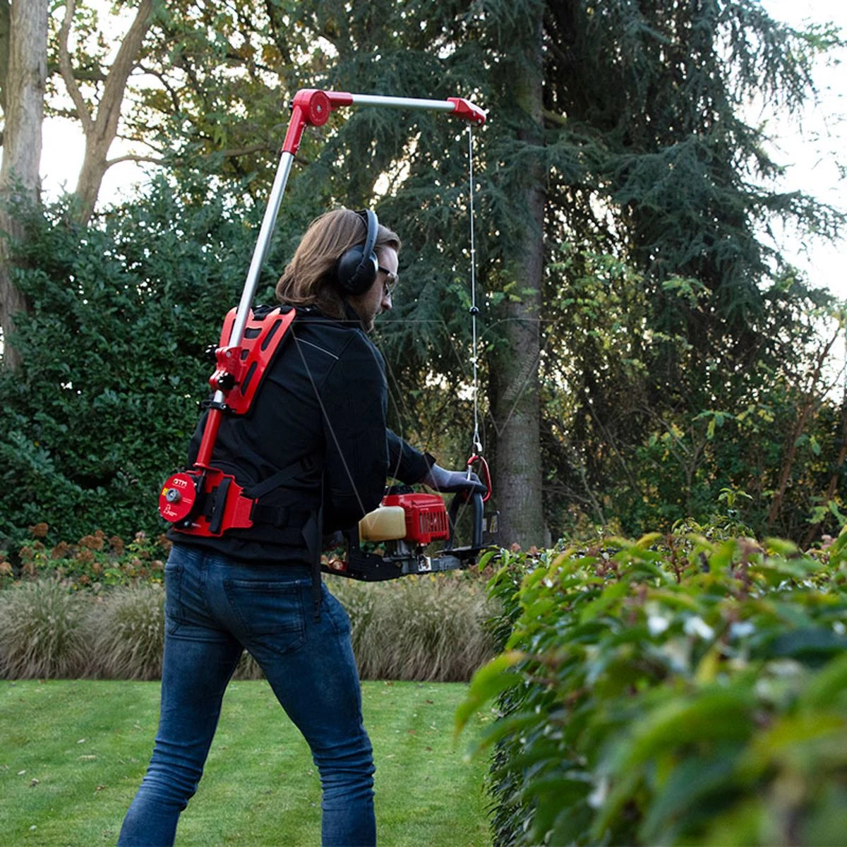 Het comfortabele harnas met verstelbare schouderbanden wordt als een rugzak gedragen. Je koppelt je heggenschaar (of ander draagbaar tuingereedschap tussen de 4,5 en 8 kg) aan de staalkabel van de katrol, die het gewicht van de schaar verplaatst naar het harnas. De kabel beweegt soepel langs gelagerde rollen in de verstelbare buis. Zo helpt de ET je de hele dag lang met heggen scheren. En omdat het minder inspannend is, werk je ook nog sneller en veiliger.